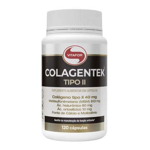COLAGENTEK® TIPO II - Vitafor é um suplemento alimentar à base de colágeno tipo II, metilsulfonilmetano (MSM), ácido hialurônico, extrato de alho em pó (Allium sativum L.) e minerais, com zero adição de açúcares.